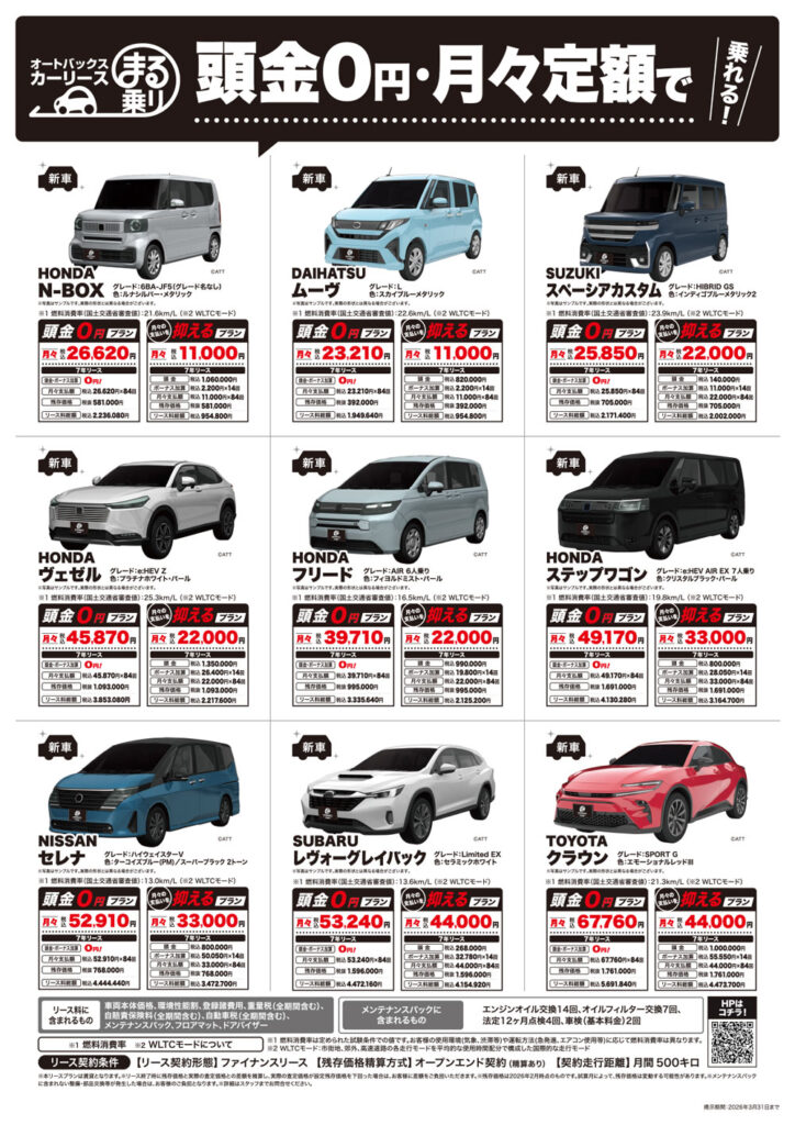 オートバックスが提供する新車・中古車を対象にしたリースプランが「まる乗り」です。リース期間中[1年~最長7年まで]にかかる費用を月々定額でお支払いいただくプランとなります。